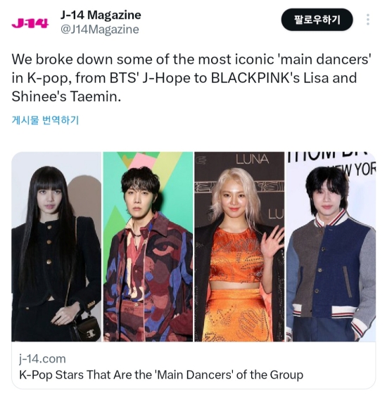 25년 역사를 자랑하는 미국 인기 하이틴 매거진 J-14는 지난 12월 24일, ‘가장 아이코닉한 K팝 메인댄서’(the most iconic ‘main dancers’ in K-pop) 8명을 선정해 발표했다.