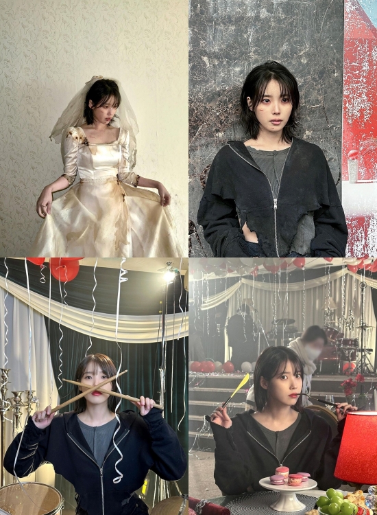 사진 속 아이유는 찢어진 일상복, 헤진 웨딩드레스 등을 입고 다양한 포즈를 취하고 있다.