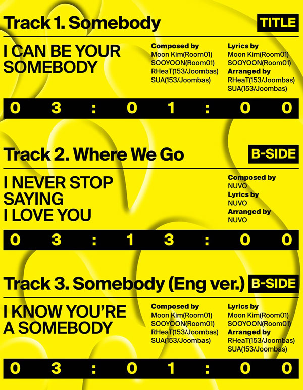 공개된 트랙리스트에 따르면 이번 앨범에는 동명의 타이틀곡 ‘Somebody’를 포함, ‘Where We Go(웨어 위 고)’, ‘Somebody (English ver.)’까지 총 3곡이 수록됐다.