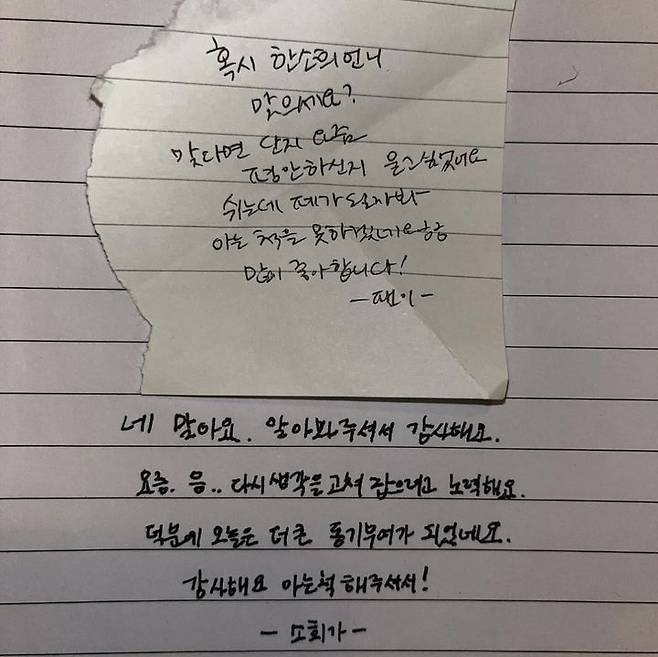 사진 속에는 “혹시 한소희 언니 맞으세요? 맞다면 단지 요즘 평안하신지 묻고 싶었어요. 쉬는데 폐가 될까 봐 아는 척을 못하겠네요. 많이 좋아합니다”라는 내용이 담겨있었고 이는 한소희의 팬이 한소희에게 준 것으로 추측된다.